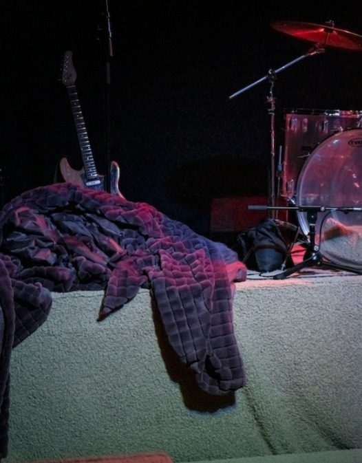 Au sommet, un espace de scène apparaît, d’abord caché sous une immense couverture. C’est là que les instruments surgissent: une batterie, une guitare électrique. Cet endroit peut être à la fois le bunker où était parfois enfermée les sœurs Wiggins et la scène où l’on finit par donner un concert.